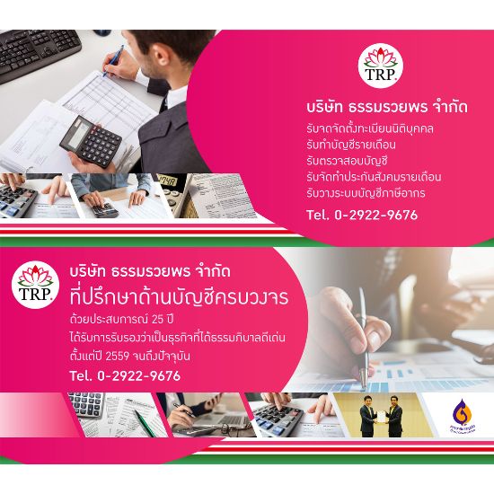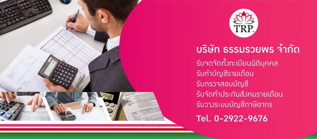 ให้บริการจดทะเบียนบริษัท รับจดทะเบียนห้างหุ้นส่วน, รับจดทะเบียนพาณิชย์, รับจดทะเบียนการค้า,รับจดทะเบียนบริษัทต่างชาติ(ต่างประเทศ) จดทะเบียนเลิกกิจการหรือจดทะเบียนประเภทอื่นๆ ที่คลอบคลุมทุกความต้องการและทำให้ชีวิตคุณง่ายขึ้น เพื่อให้ท่านผู้ประกอบการสามารถจัดตั้งธุรกิจตามวัตถุประสงค์ให้เป็นไปตามระเบียบ และถูกต้องตามที่กฎหมายกำหนด จำเป็นจะต้องพิจารณาปัจจัยหลายด้านในการเริ่มต้นจัดตั้งธุรกิจไม่ว่าจะเป็นเรื่องของความน่าเชื่อถือ รายได้ต่อปี ประเภทของลูกค้า ทุนจดทะเบียน จำนวนผู้ร่วมลงทุน ผู้ถือหุ้น ความคล่องตัวในการบริหารงาน ตลอดจนแผนการขยายธุรกิจต่อไปในอนาคต ธรรมรวยพร มีเจ้าหน้าที่ให้คำปรึกษาที่มีประสบการณ์ จะไม่ต้องเสียเวลาลองผิดลองถูกอีกต่อไป สอบถามรายละเอียดเพิ่มเติม บริษัท ธรรมรวยพร จำกัด โทรศัพท์ : 08-1554-0544 Email : info@trpacc.com ที่อยู่ : 116/648 หมู่ 11ถนนตลิ่งชัน ตำบลบางรักพัฒนา อำเภอบางบัวทอง จังหวัดนนทบุรี 11110